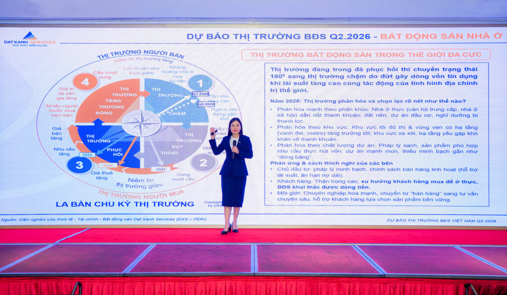 Trong bối cảnh tình hình địa chính trị thế giới tiềm ẩn nhiều rủi ro, kinh tế toàn cầu diễn biến khó lường, biến động lãi suất trong nước vẫn đang được neo ở mức cao, thị trường bất động sản Việt Nam đang đứng trước sự điều chỉnh tất yếu để phù hợp với diễn biến thực tế. Theo báo cáo Quý 1.2026 và dự báo Quý 2.2026 của Viện nghiên cứu Kinh Tế – Tài chính – BĐS Dat Xanh Services (DXS-FERI), thị trường BĐS Quý 1/2026 đã chuyển trạng thái, từ vùng thị trường phục hồi của giai đoạn 2024–2025 sang vùng thị trường chậm. Tuy nhiên, đây là phản ứng tức thời của thị trường và sẽ không duy trì lâu ở trạng thái này nếu các nút thắt được gỡ bỏ.