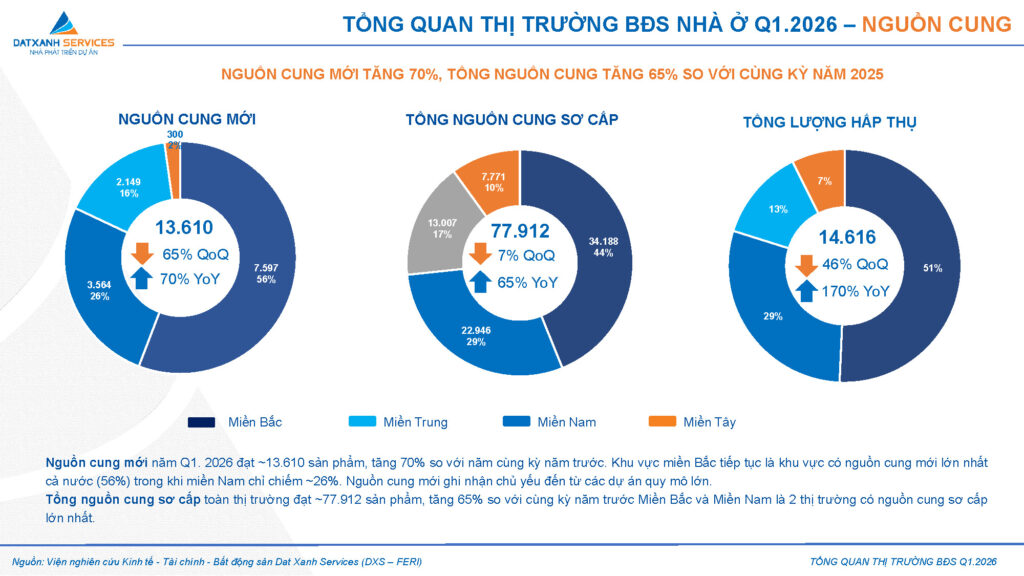 Sau giai đoạn phục hồi trong năm 2025, thị trường bất động sản bước sang Quý 1.2026 với nhịp điều chỉnh rõ nét. Nguồn cung mới ước đạt ~13.600 sản phẩm tăng ~70% theo năm nhưng giảm ~65% theo quý; nâng tổng nguồn cung sơ cấp đạt ~78.000 sản phẩm, tăng 65% so với cùng kỳ năm 2025 nhưng giảm 7% so với quý 4.2025. Thanh khoản cũng có dấu hiệu chậm lại, tổng lượng hấp thụ đạt ~14.600 sản phẩm (tỷ lệ 15-20%) tăng 170% so với cùng kỳ năm trước, nhưng giảm 46% so với quý 4.2025 phản ánh tâm lý thận trọng hơn từ phía khách hàng.