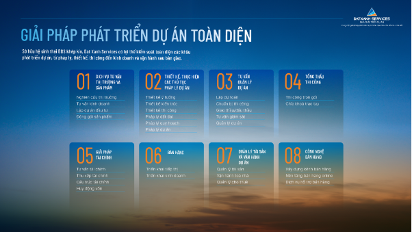 Thấu hiểu những lo lắng, trăn trở và đáp ứng nhu cầu ngày càng lớn của nhiều chủ đầu tư, chủ đất trong bối cảnh khung pháp lý đòi hỏi năng lực ngày càng cao, Dat Xanh Services cung cấp giải pháp phát triển dự án toàn diện cho Chủ đầu tư – Chủ đất thông qua 8 gói dịch vụ tích hợp, từ nghiên cứu thị trường, thực hiện các thủ tục pháp lý, thiết kế sản phẩm, triển khai kinh doanh, tổng thầu thi công đến quản lý vận hành và công nghệ bán hàng.