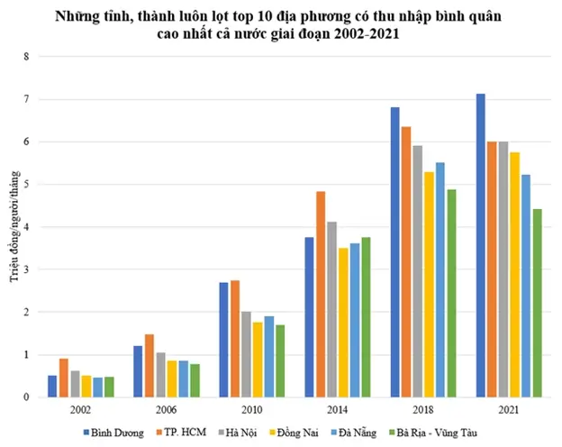So với năm 2002, top 10 tỉnh, thành có thu nhập bình quân cao nhất cả nước năm 2021 có sự thay đổi rõ rệt. Trong đó, 6/10 tỉnh, thành vẫn lọt top 10 địa phương có thu nhập bình quân cao nhất cả nước sau 20 năm. Cụ thể, các địa phương đó là: Bình Dương, TP. HCM, Hà Nội, Đồng Nai, Đà Nẵng và Bà Rịa – Vũng Tàu. Đồng thời, 6 địa phương này cũng luôn lọt top 10 địa phương có thu nhập bình quân cao nhất cả nước trong 20 năm qua.