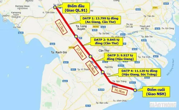 Dự án được chia thành 4 dự án thành phần gồm: dự án thành phần 1 (An Giang) dài hơn 57km, với vốn là 13.799 tỷ đồng. Dự án thành phần 3 (Hậu Giang) dài gần 37km, với vốn là 9.927 tỷ đồng. Dự án thành phần 4 (Sóc Trăng) dài gần 57km, với vốn là 11.120 tỷ đồng.