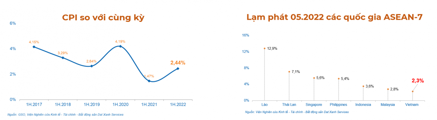 Về lạm phát, trong bối cảnh lạm phát đang leo thang trên thế giới nói chung và khu vực Đông Nam Á nói riêng, tình hình lạm phát tại Việt Nam vẫn trong tầm kiểm soát, cụ thể CPI 6 tháng đầu năm 2022 tăng 2,44 %, cao hơn cùng kỳ 2020 nhưng thấp hơn cùng kỳ từ 2017 – 2020. CPI tháng 5 của Việt Nam thấp nhất tại một số quốc gia ASEAN -7
