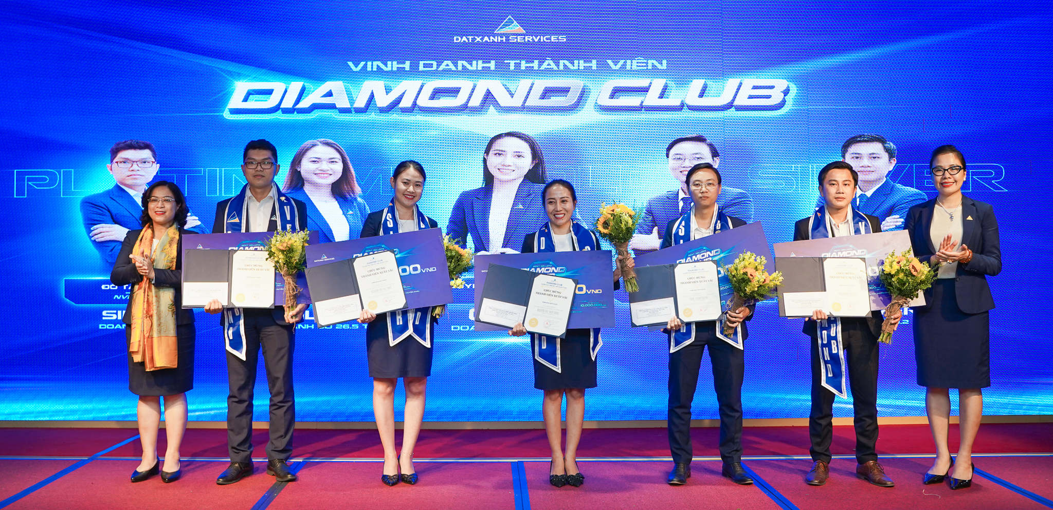 Đặc biệt nhất trong buổi lễ chính là lễ kết nạp thành viên Diamond Club dành cho những chiến binh kinh doanh xuất sắc nhất. 5 thành viên Diamond Club là những viên kim cương tỏa sáng nhất Dat Xanh Services trong quý vừa qua.