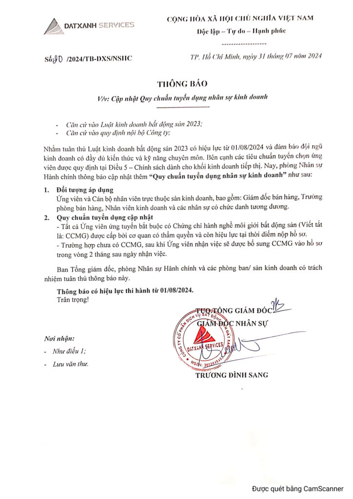 Nhằm tuân thủ Luật kinh doanh bất động sản 2023 có hiệu lực từ 01/08/2024 và đảm bảo đội ngũ kinh doanh có đầy đủ kiến thức và kỹ năng chuyên môn. Bên cạnh các tiêu chuẩn tuyển chọn ứng viên được quy định tại Điều 5 – Chính sách dành cho khối kinh doanh tiếp thị. Nay, phòng Nhân sự Hành chính thông báo cập nhật thêm “Quy chuẩn tuyển dụng nhân sự kinh doanh”…