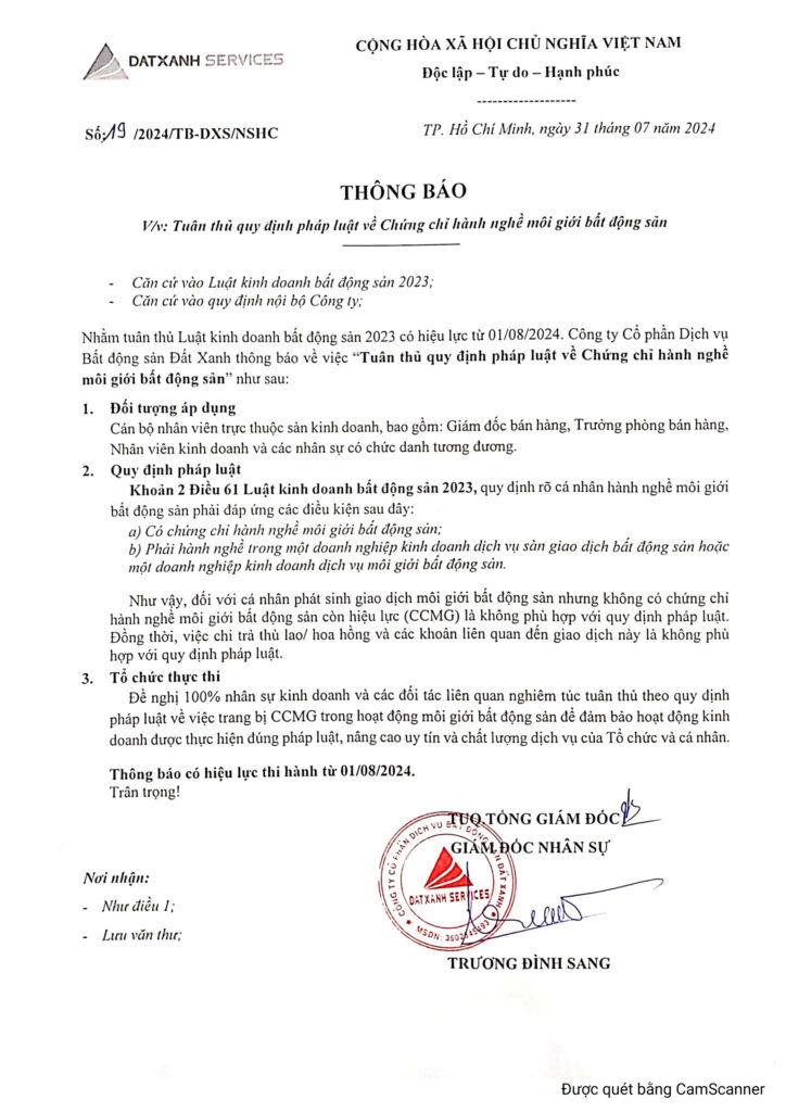 Nhằm tuân thủ Luật kinh doanh bất động sản 2023 có hiệu lực từ 01/08/2024. Công ty Cổ phần Dịch vụ Bất động sản Đất Xanh thông báo về việc “Tuân thủ quy định pháp luật về Chứng chỉ hành nghề môi giới bất động sản”…