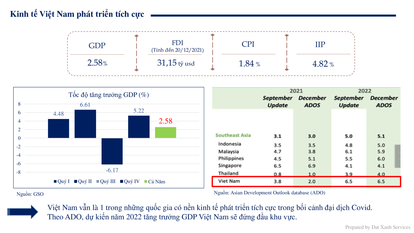 Đánh giá thị trường Việt Nam năm 2021, các chuyên gia đều cho rằng, mặc dù ảnh hưởng từ dịch bệnh khiến GDP giảm xuống chỉ còn 2.58%, thế nhưng thị trường BĐS năm 2021 tiếp tục nhận được nhiều xung lực phát triển mới như sự điều chỉnh cơ chế kinh doanh BĐS, cơ cấu cung – cầu, đặc biệt chỉ số tín nhiệm quốc gia của Việt Nam được nâng hạng từ triển vọng lên tích cực là tín hiệu mạnh mẽ về thu hút nguồn vốn đầu tư nước ngoài FDI. Việt Nam chắc chắn sẽ trở thành điểm nóng đầu tư trong những năm tới đây.